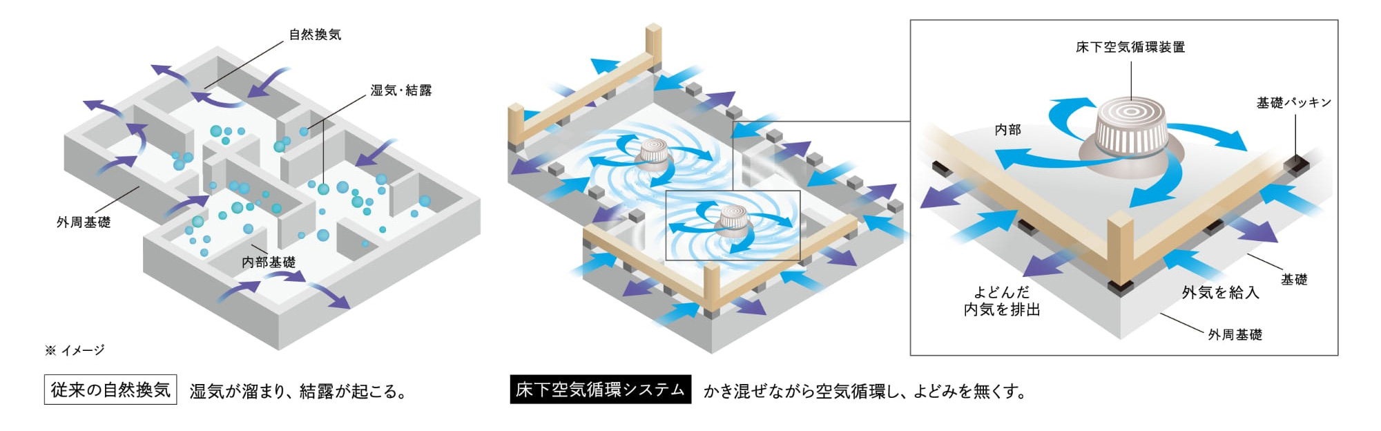 このシステムにより、床下の空気がかき混ぜられながら循環されるため、よどみをなくします。