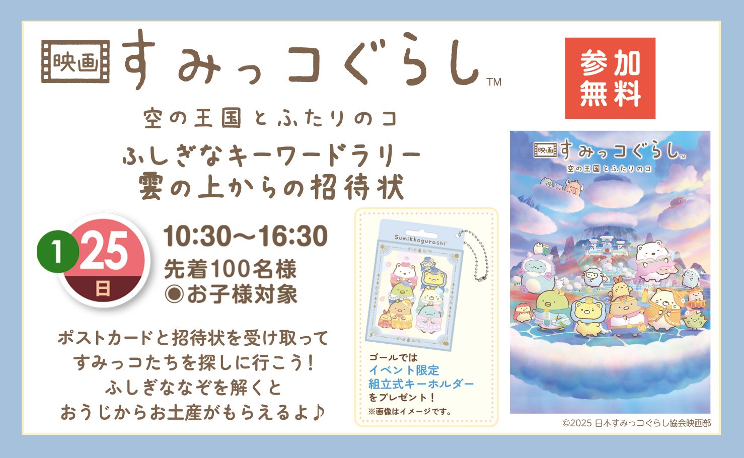 【2026年1月25日(日)】映画 すみっコぐらし 空の王国とふたりのコ ふしぎなキーワードラリー 雲の上からの招待状 2025年12月23日 最終更新日時 : 2025年12月23日 child ※詳しくは画像をご確認ください。