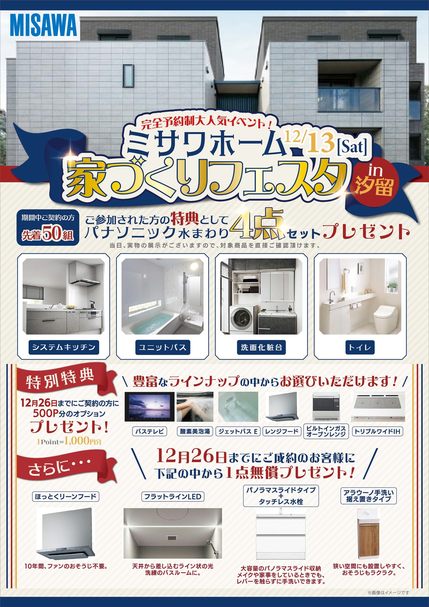 【ミサワホーム】家づくりフェスタinパナソニック汐留 2025年12月8日 最終更新日時 : 2025年12月10日 child 日本最大級のパナソニック様ショールームにて、水回り設備を見て・触って・体感できる最新設備体験ツアーを開催致します。 キッチン・バスルーム・洗面化粧台・トイレなどの水回り設備をご見学の上、ご参加特典として上記水回り設備4点のプレゼント!という大型イベントです。 ぜひこの機会にご参加いただき、より良い住まいづくりをお進めください。 2025年12月13日(土) お問い合わせはこちら 見学予約|1回に3棟まで可能