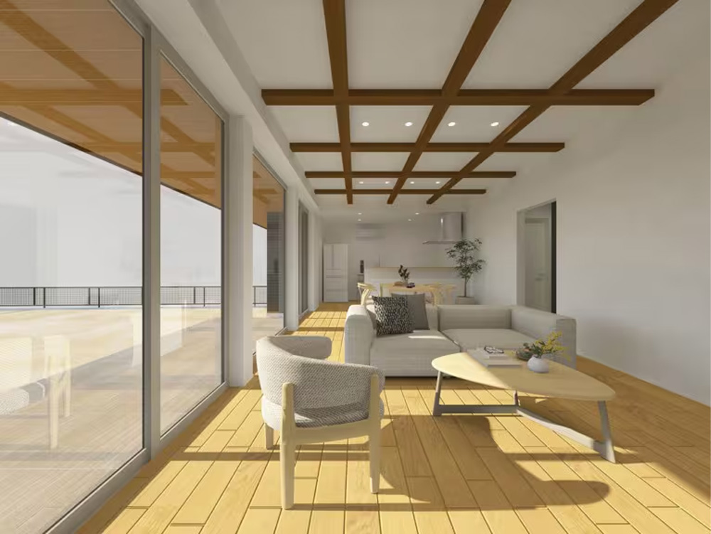 ・折り上げ天井+あらわし梁を採用したLDK