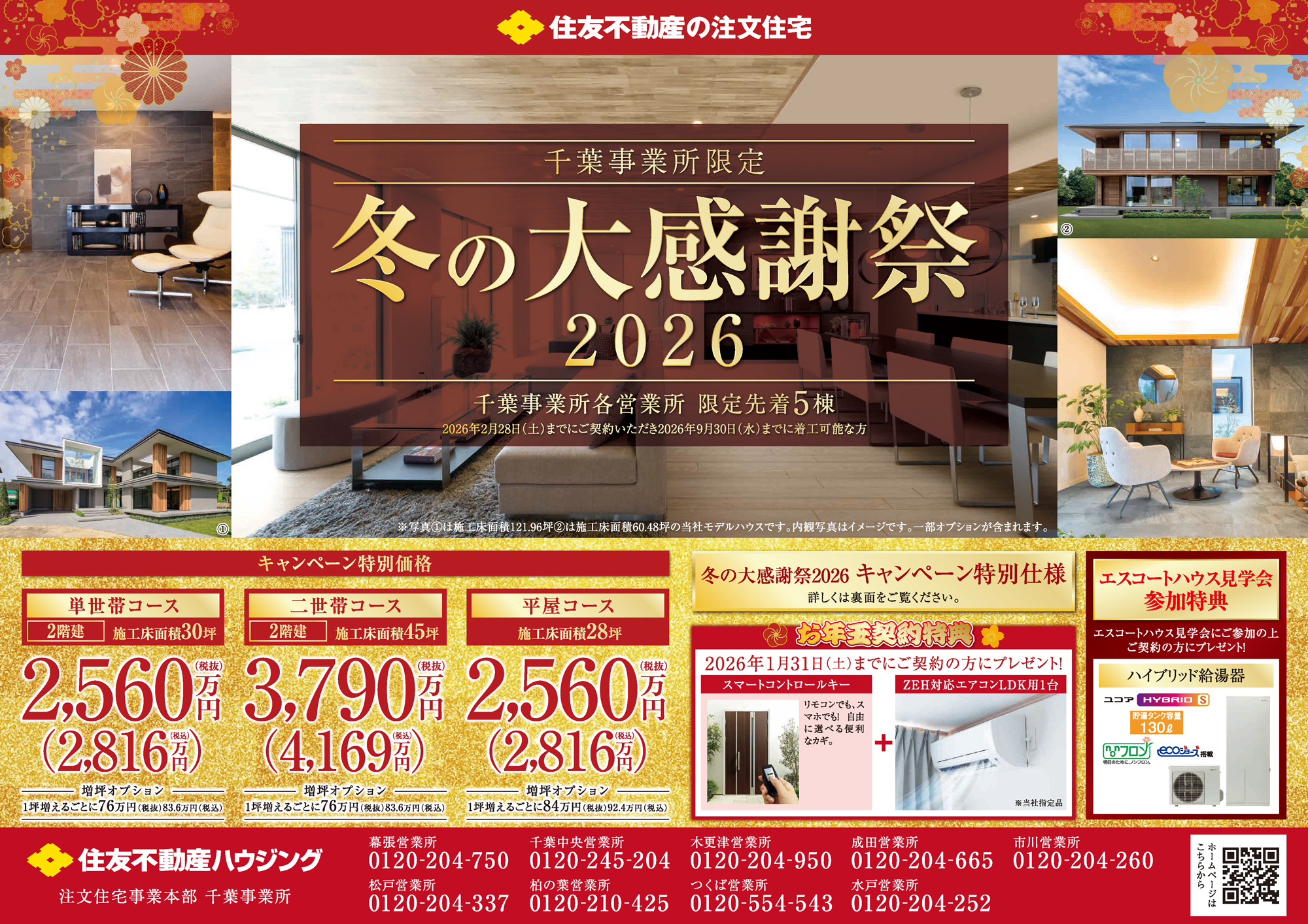 【住友不動産ハウジング】冬の大感謝祭2026 開催! 2026年1月10日 最終更新日時 : 2026年1月24日 child 冬の大感謝祭2026キャンペーン特別価格・特別仕様 千葉事業所各営業所 先着5棟2026年2月28日(土)までにご契約いただき、2026年9月30日(水)までに着工可能な方。 お問い合わせはこちら