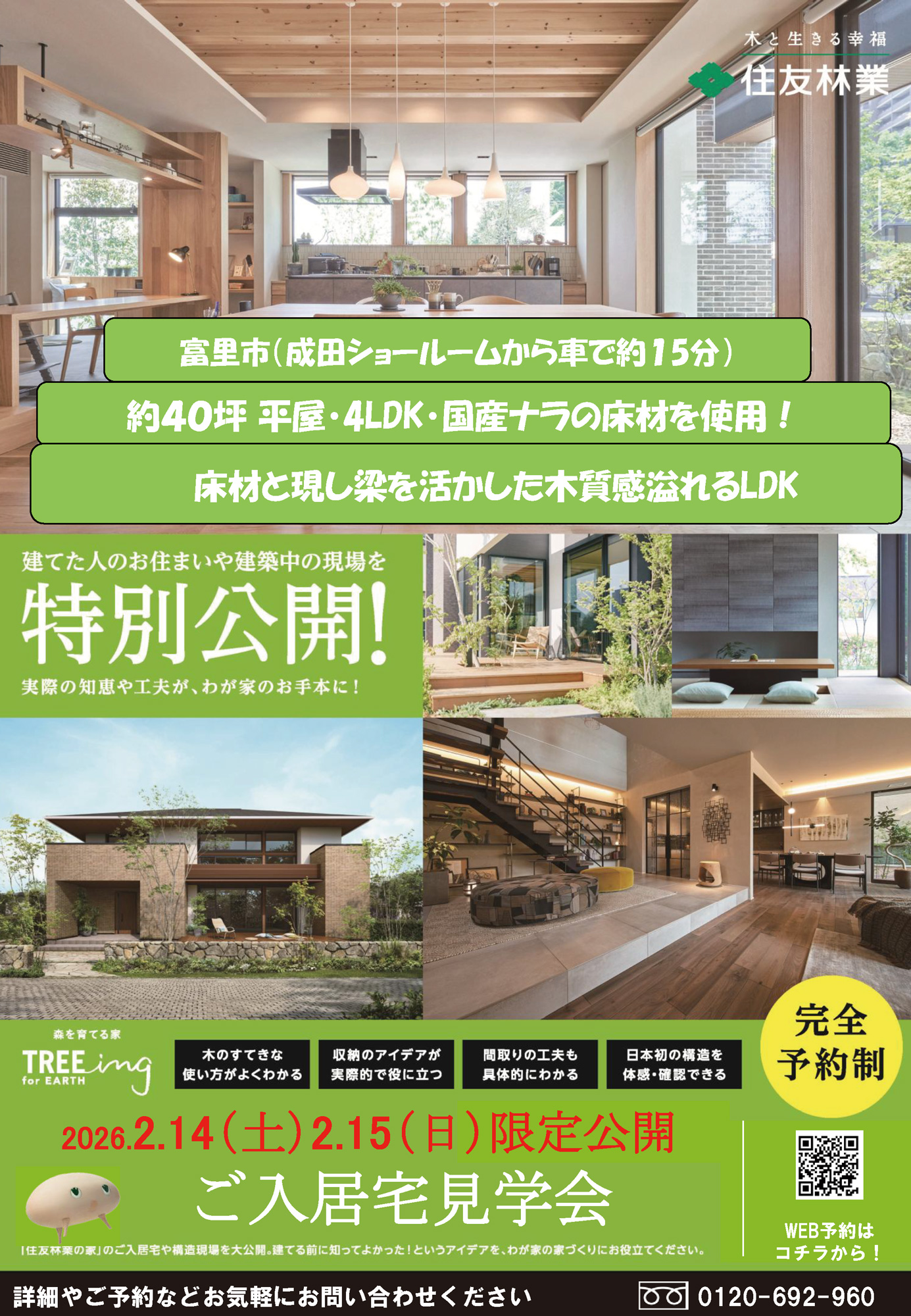 【住友林業】《富里市》入居宅見学会! 2026年1月30日 最終更新日時 : 2026年1月31日 child 2/14(土)・2/15(日)に富里市にて平屋約40坪の入居宅見学会を開催いたします。 オーナー様の住み始めてからの生の声や、床の「踏み心地」、木の「香り」など、この機会に是非ご体感ください! お問い合わせはこちら